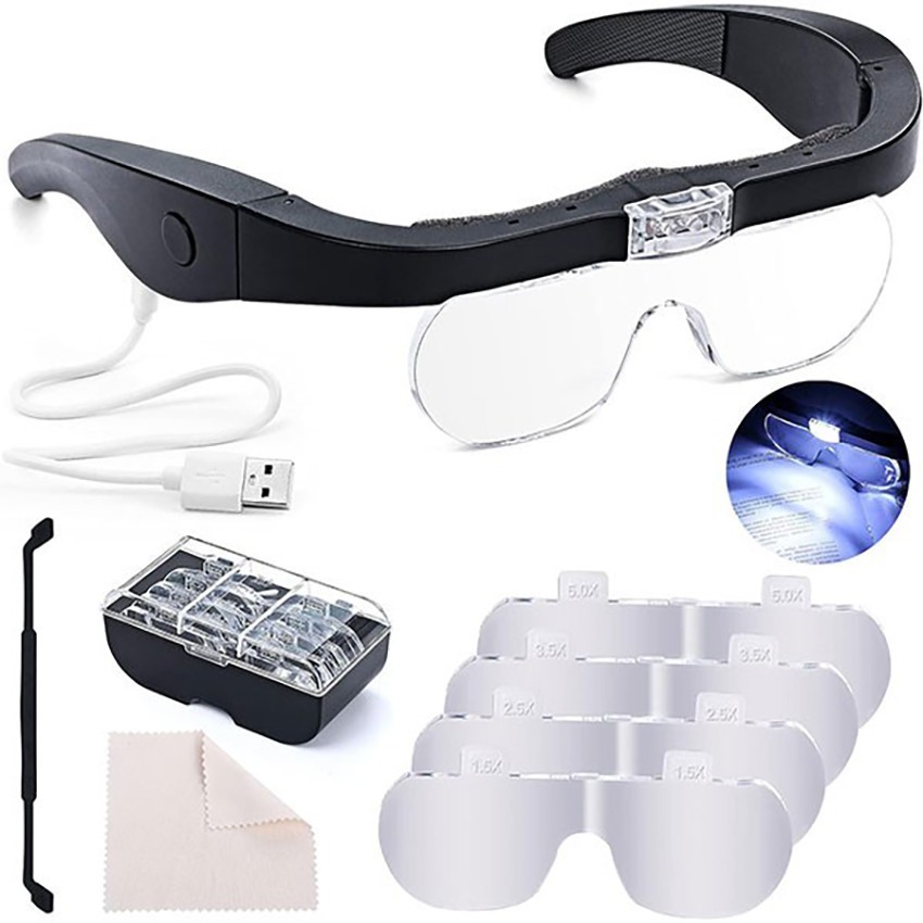 MG81001-G led ışıklı gözlük kafa büyüteci; birbirinden farklı ölçeklerde 5 adet merceğe sahip, saatçilerin, elektronik devre tamiri yapanların, kuyumcuların sıklıkla kullandığı led ışıklı kafa tipi gözlük büyüteçtir.