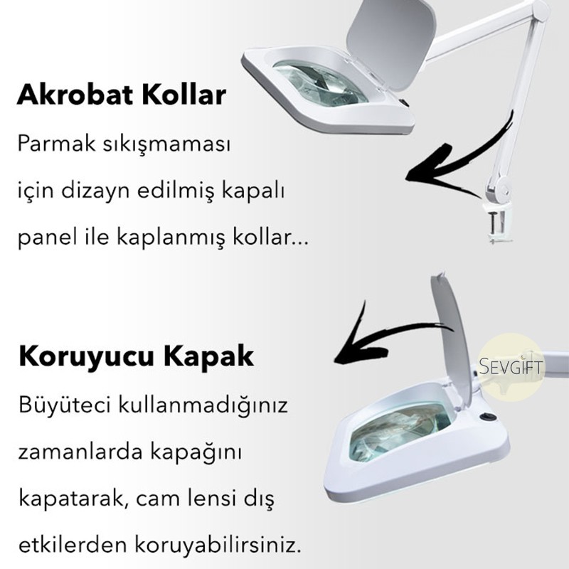 - Akrobat kolları sayesinde istenilen görüş açısına göre büyüteçin pozisyonu ayarlanabilir. Büyüteçin akrobat kollarının ayarlanması için çok az bir kuvvet uygulama yeterlidir. Yapısındaki hassas yaylar sayesinde büyüteçe şık bir hareket imkanı sağlanmıştır.