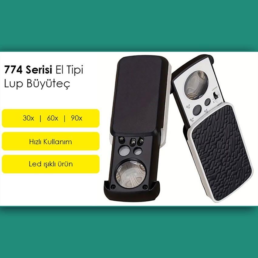 774 serisi büyüteç, 30X, 60X ve 90X büyütme kapasitesine sahip üç ayrı mercek ile donatılmış, elektronik tamir, koleksiyonculuk ve detaylı inceleme gibi alanlarda kullanılabilen ışıklı bir lup büyüteçtir. Hem amatör hem de profesyonel kullanıcılar için uygundur.