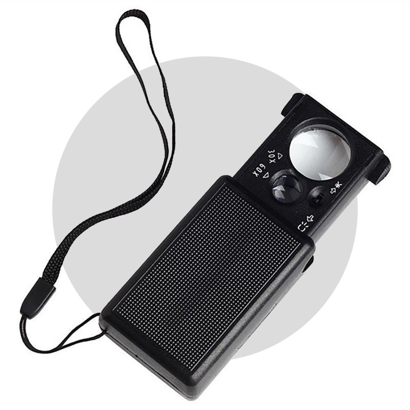 Mini el tipi mor ışıklı büyüteç; elde veya cepte taşıması kolay, 30x ve 60x gibi iki farklı merceğe sahip olan hassas ve kullanması kolay büyüteçtir.