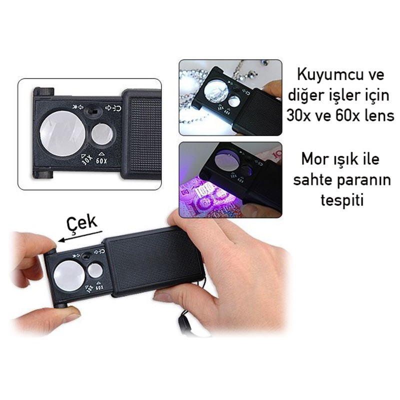 mini el tipi mor ışıklı büyüteç; elde veya cepte taşıması kolay, 30x ve 60x gibi iki farklı merceğe sahip olan hassas ve kullanması kolay büyüteçtir.
