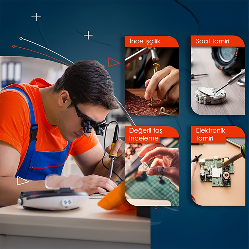 LED ışıklı kafa büyüteci; değiştirilebilir lensleri ve güçlü LED aydınlatması ile küçük parçaların detaylı incelenmesini sağlar. Kuyumculuk, elektronik tamiri, modelcilik ve hassas montaj işleri için idealdir.