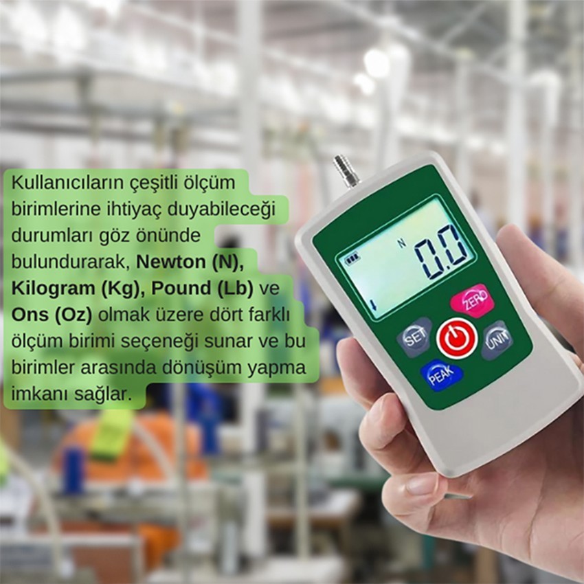 - AMF-500 dijital itme-çekme kuvveti ölçer cihazı, kullanıcıların çeşitli ölçüm birimlerine ihtiyaç duyabileceği durumları göz önünde bulundurarak, Newton (N), Kilogram (Kg), Pound (Lb) ve Ons (Oz) olmak üzere dört farklı ölçüm birimi seçeneği sunar ve bu birimler arasında dönüşüm yapma imkanı sağlar. Bu özellik, farklı endüstri standartlarına ve ölçüm tercihlerine uyum sağlayarak, uluslararası çalışma ortamlarında ve çeşitli mühendislik disiplinlerinde esneklik ve kolaylık sunar. Kullanıcılar, ölçüm sonuçlarını kendi ihtiyaçlarına en uygun birimde alabilir ve bu sayede daha profesyonel, doğru ve kapsamlı analizler yapabilirler.