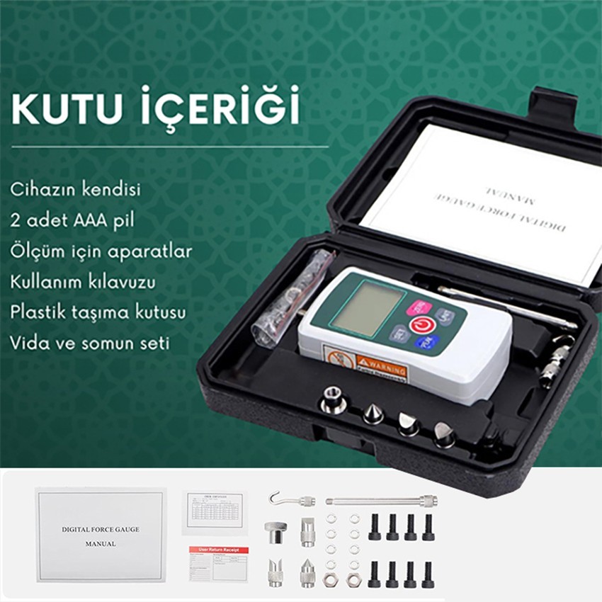 - AMF-500 dijital itme-çekme kuvveti ölçer cihazı, kullanım kolaylığı ve verimliliği artırmak amacıyla otomatik arka ışık ve buzzer alarm fonksiyonlarına sahiptir. Bu özellikler, kullanıcıların farklı çalışma koşullarında bile cihazı rahatça kullanabilmelerini sağlar. Otomatik arka ışık özelliği, düşük ışık koşullarında bile ekranın net bir şekilde görülmesine olanak tanır, böylece kullanıcılar her zaman açık ve kolay okunabilir bir ekran ile çalışabilirler. Buzzer alarm fonksiyonu ise, belirlenen limit değerlerinin aşılması gibi önemli durumlarda kullanıcıları sesli bir uyarı ile bilgilendirir.