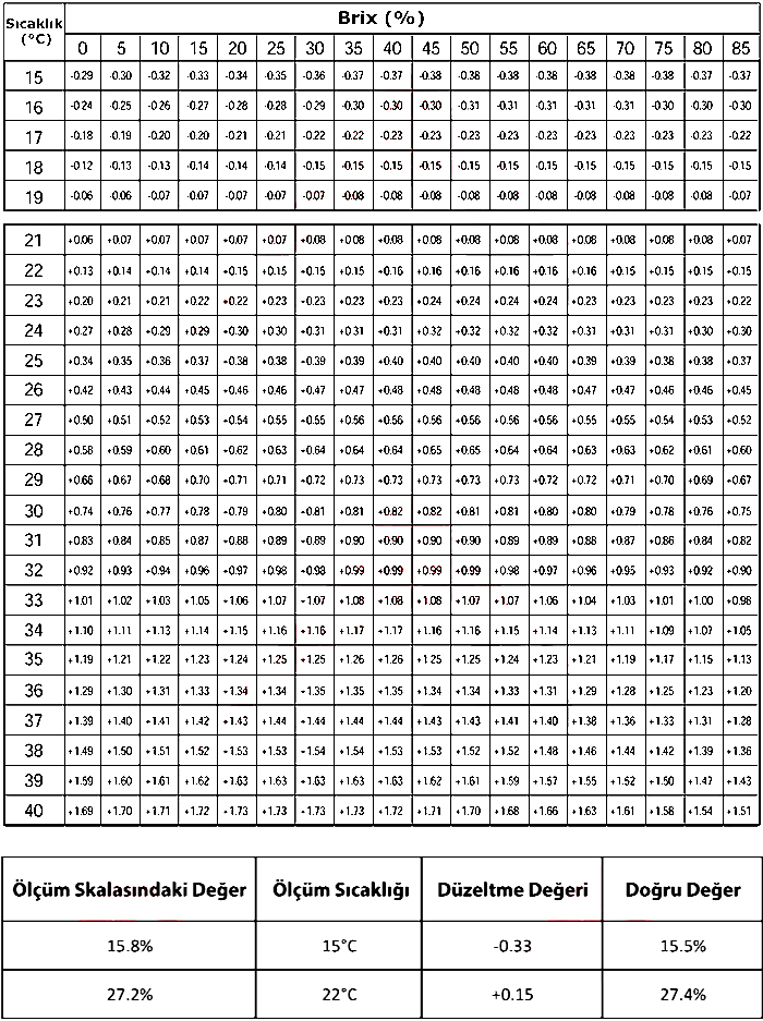 5-Eğer ölçüm yaparken kullanılan sıcaklık 20°C'den farklıysa, elde edilen Brix değerini sıcaklık düzeltme tabloları veya formülleri kullanarak düzeltmeniz gerekebilir. Ölçülen numunenin brix değeri ve sıcaklık değeri aşağıdaki tabloda hangi rakama denk geliyorsa o rakama göre ya toplanır ya da çıkarılır. Ölçüm skala tablosundaki 15 ile 19 derece arasında olan rakamlar ölçüm değerinden çıkarılır, 21 ile 40 derece arasında olanlar ise ölçüm değeriyle toplanır. 20°C sıcaklıkda ölçülen numunenin değeri doğru değerdir.