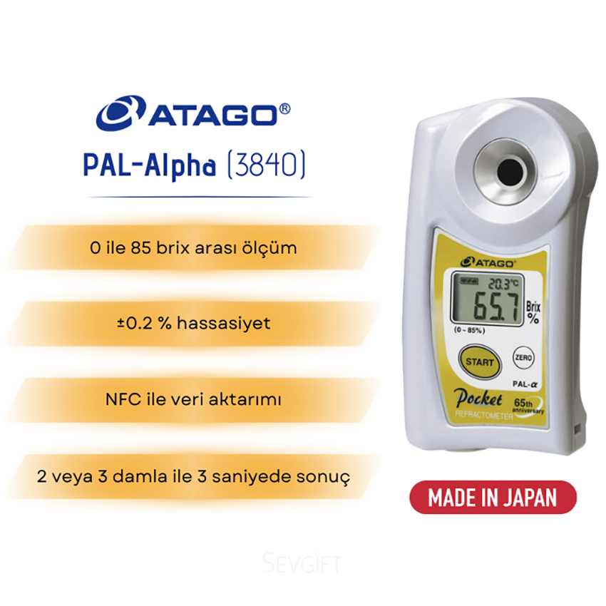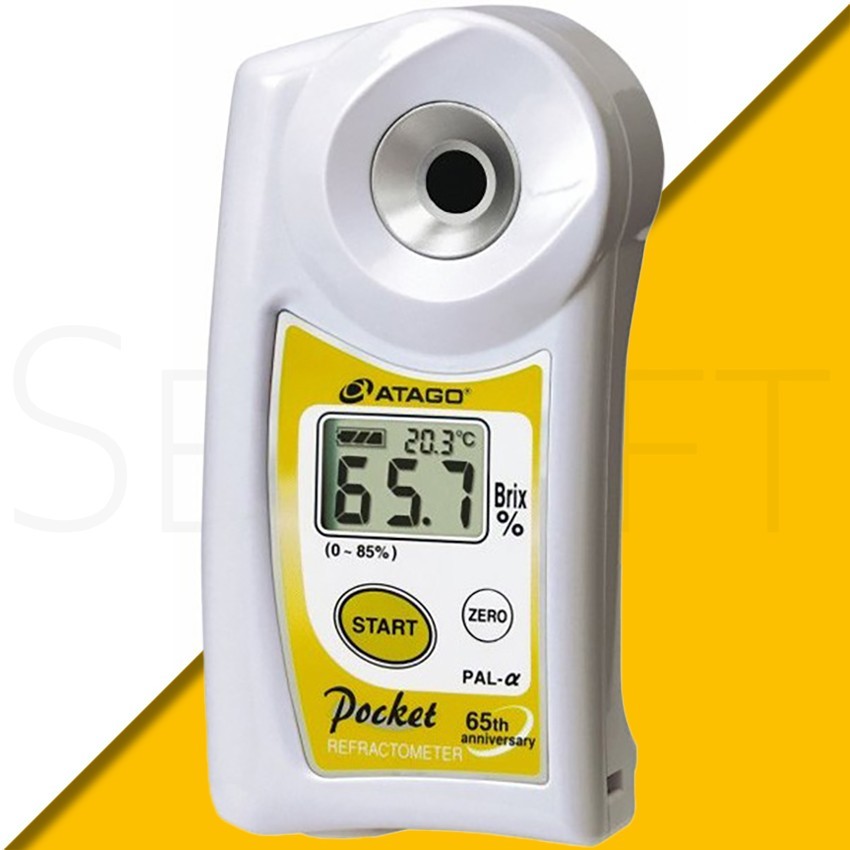 Atago’nun 65. yıl dönümüne özel olarak tasarlanan PAL-α modeli, geniş bir ölçüm aralığı (0-85% brix) sunarak uygun fiyatıyla öne çıkan bir briks ölçer cihazdır. Bu model, yemek hazırlama süreçlerinde kullanılan örneklerden farklı sıvı numunelere kadar çok çeşitli malzemelerin ölçümünde oldukça kullanışlıdır. Suya dayanıklı tasarımı sayesinde PAL-α cihazı, akan su altında kolayca temizlenebilir. Ayrıca, diğer PAL serisi cihazlarda bulunan üstün özelliklerin tamamı bu modelde de yer almaktadır.