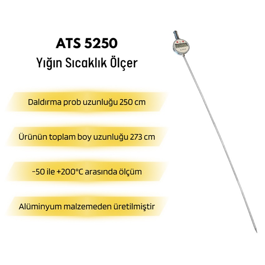- ATS 5250 yığın sıcaklık ölçer cihazının tutma sapı ve gösterge dahil olmak üzere toplam uzunluğu 273 cm'dir, bu sayede geniş ve derin yığınlarda dahi ölçüm yapılabilir. Prob uzun olmasının yanı sıra 10 mm gibi ince yapıda olduğundan kırılmaması için daldırma yaparken dikkatli olunmalıdır.