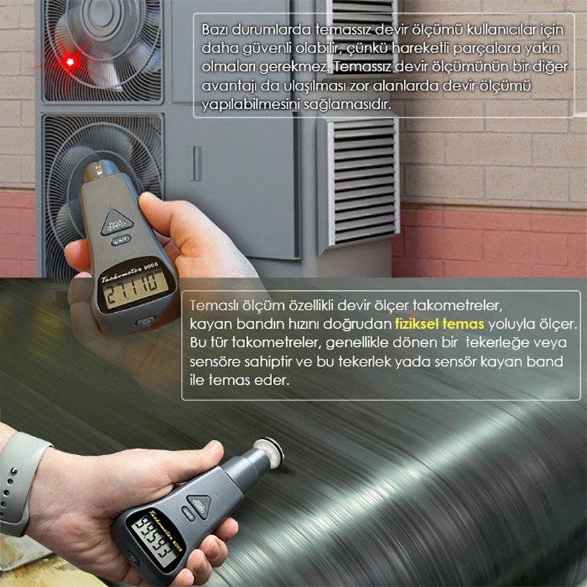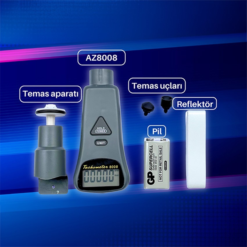 AZ 8008 takometre devir ölçer cihazı; hem temassız yani optik, hem de yanında gelen çeşitli uçlar ile temas ederek yani dokundurarak devir ölçümü yapan ölçüm cihazlarıdır.