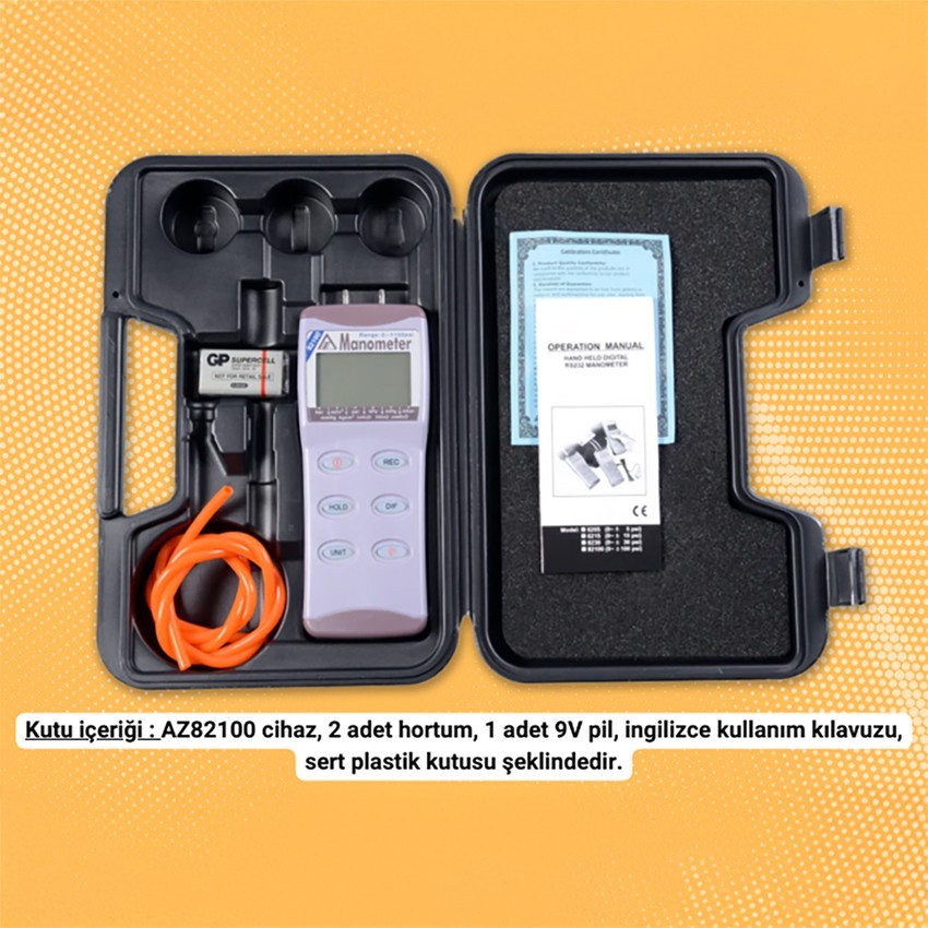 AZ 82100 dijital manometre cihazı, iki farklı noktadaki basınç değerleri arasındaki farkı geniş bir aralıkta ölçebilen hassas bir fark basınç ölçer cihazıdır. Cihaz, 100 psi (6895 mbar) gibi geniş bir basınç aralığını ölçebilmektedir ve ilaç, kimya, gıda ve enerji endüstrileri gibi çeşitli sektörlerde kullanılmaktadır.