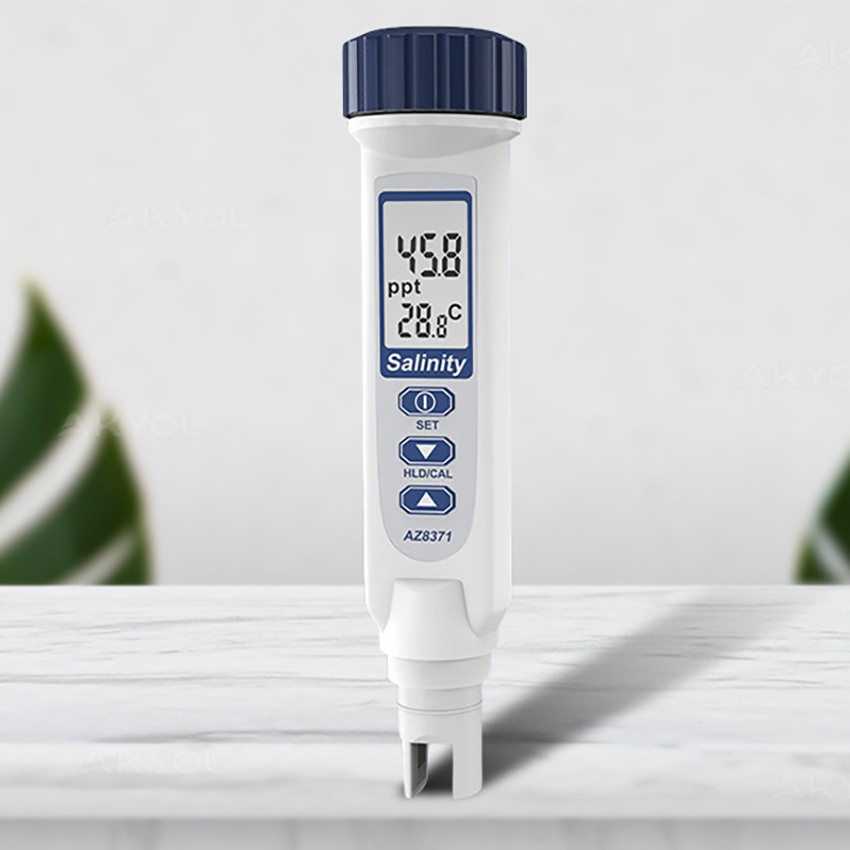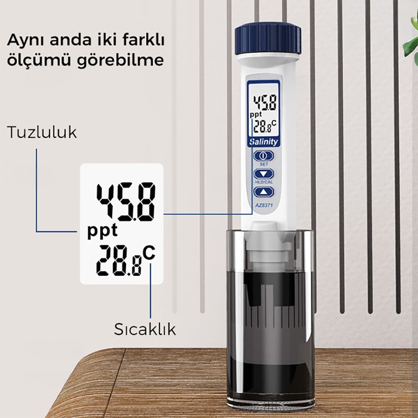 - AZ 8371 Dijital Tuzluluk Ölçer; gıda işleme, akvaryum, balık üretme, laboratuvar, kalite kontrol, yüzme havuzları, okullar ve kolejler gibi yerler ve alanlarda tuzluluk ölçümü için hassas bir ölçüm cihazıdır.