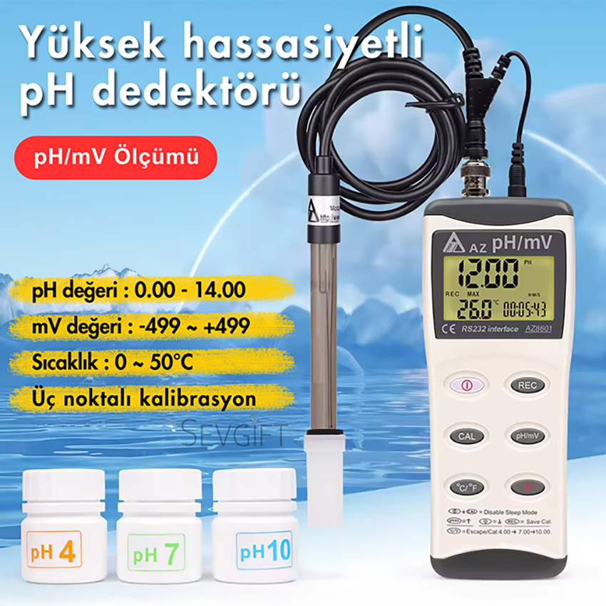 - Taşınabilir AZ 8601 ölçüm cihazı, pH ve oksidasyon indirgeme potansiyeli (mV) değerlerini ölçebilir ve su kalitesi test uygulamalarında yaygın olarak kullanılmaktadır.