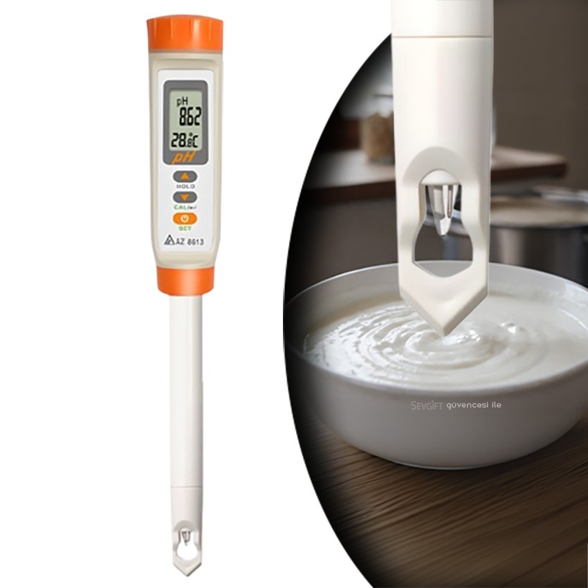 AZ 8613 Gıda pH Ölçer, değiştirilebilir problu ve sivri (mızrak) uçlu tasarımı sayesinde peynir, et, hamur ve yoğurt gibi yarı katı gıdalarda doğrudan ve hassas pH ölçümü yapar. 3 nokta kalibrasyon, stabilite göstergesi ve elektrot uyarı sistemi ile güvenilir sonuç sunar. Gıda üretimi, et işleme, süt ve peynir üretimi ile fırıncılık uygulamalarında kalite kontrol için ideal profesyonel pH metredir.