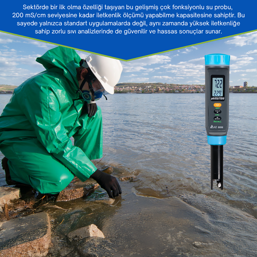AZ 8698 cihazı; pH ve iletkenlik ölçüm özellikleri, arka aydınlatmalı net lcd ekranı ve korozyona dayanıklı değiştirilebilir sensörü sayesinde,