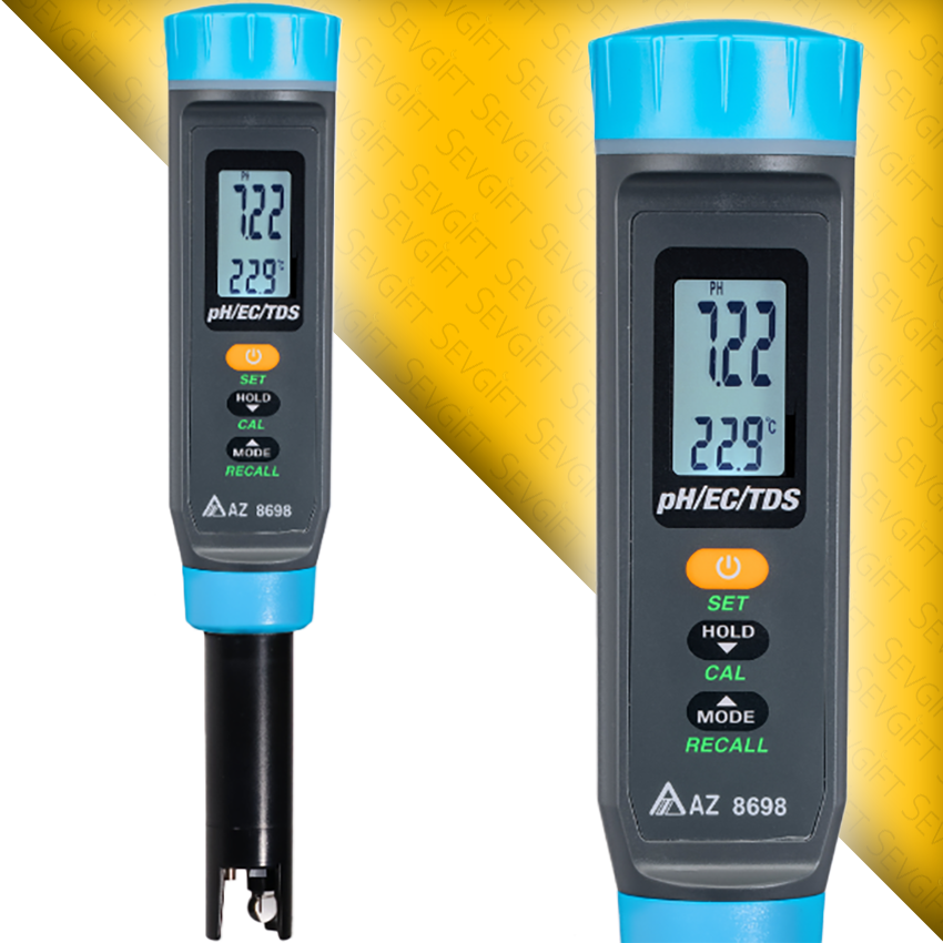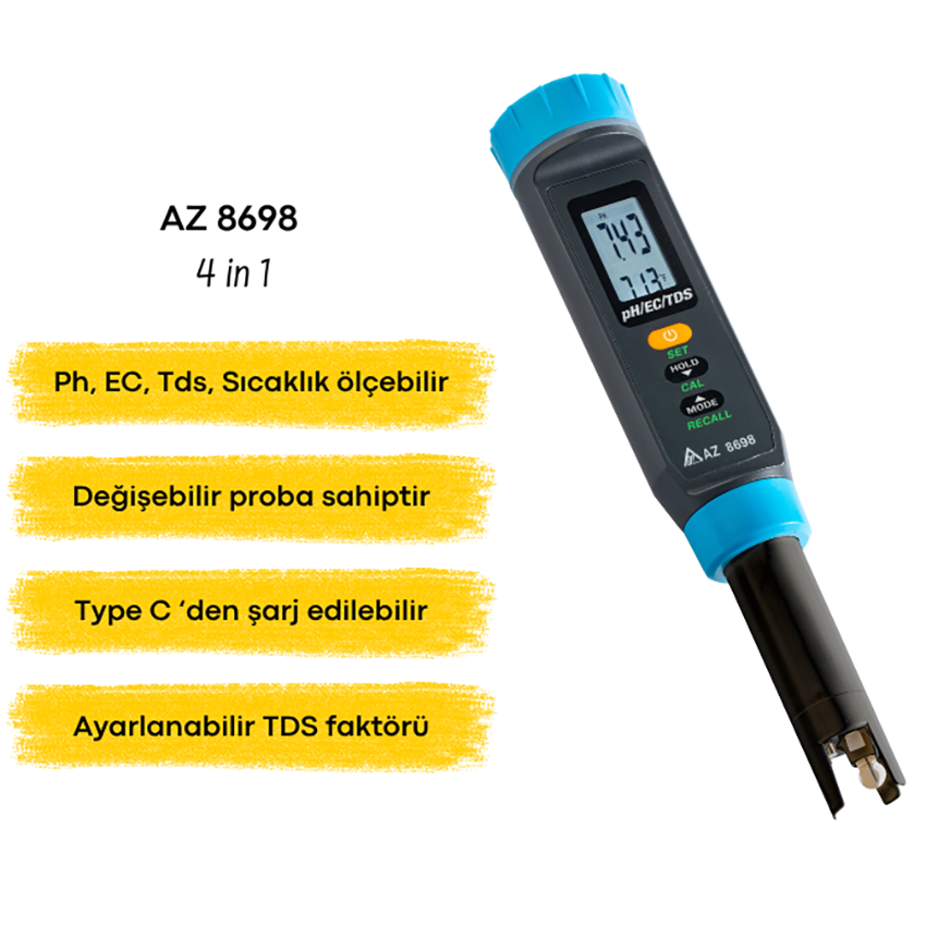 - AZ 8698 su kalitesi ölçer; pH, elektriksel iletkenlik (EC), toplam çözünmüş madde (TDS) ve sıcaklık gibi 4 parametrenin ölçümünü yapabilmektedir.