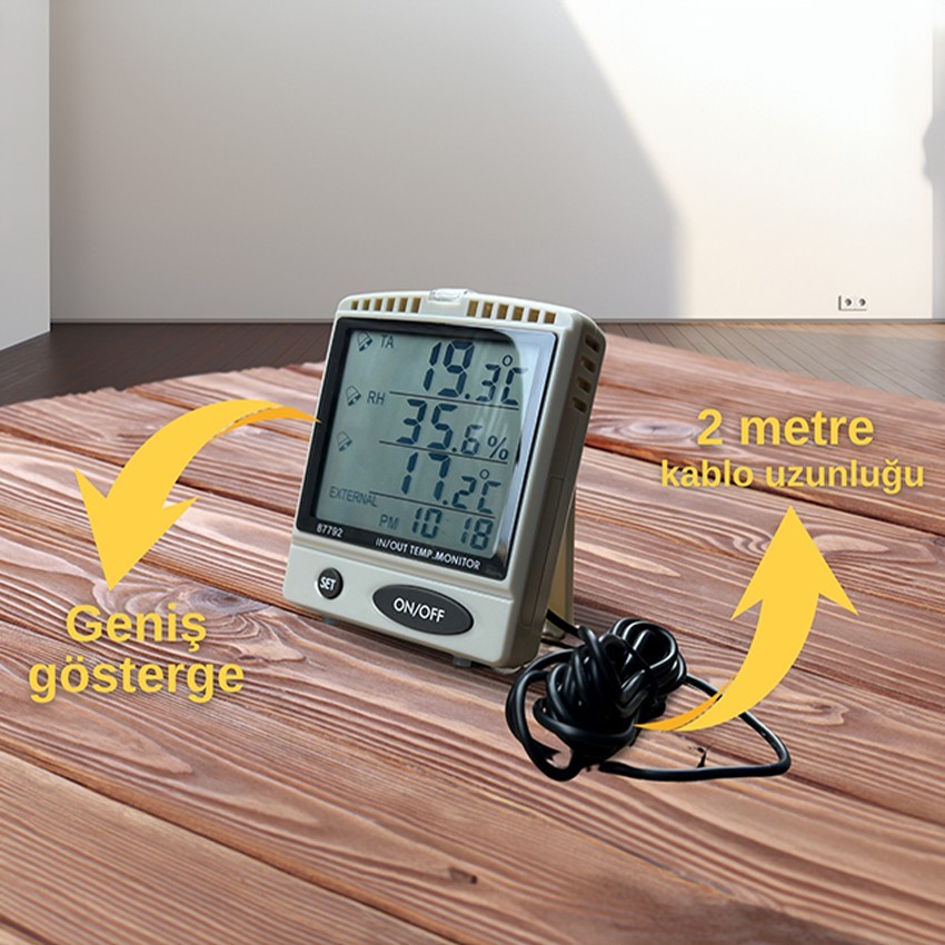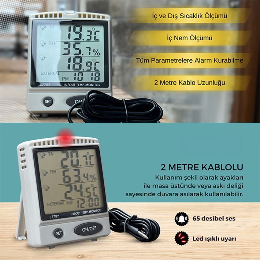 AZ 87792 alarm özellikli ölçüm cihazı; iç mekan sıcaklık ve nem, 2 metre kablosu sayesinde de dış mekan sadece sıcaklık ölçümü yapabilen, geniş dijital göstergeli ölçüm cihazıdır.