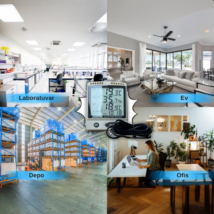 AZ 87792 iç ve dış ortam sıcaklık ve nem ölçebilen cihazlar, geniş bir kullanım alanına sahiptir. Bu cihazlar, depolar, laboratuvarlar, ofisler, evler, seralar, müze ve arşiv odaları gibi sıcaklık ve nemin önemli olduğu ortamlarda kullanılır. Bu cihazlar, hem iç hem de dış koşulların sürekli takip edilmesi gereken herhangi bir yerde etkili çözümler sunar.