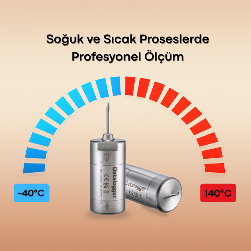 - Toplam 48.000 veri kaydı saklama kapasitesi sayesinde uzun süreli izleme uygulamalarına uygundur ve pil bitene kadar çoklu veri kaydı yapabilmesiyle özellikle sürekli takip gerektiren proseslerde avantaj sağlar.