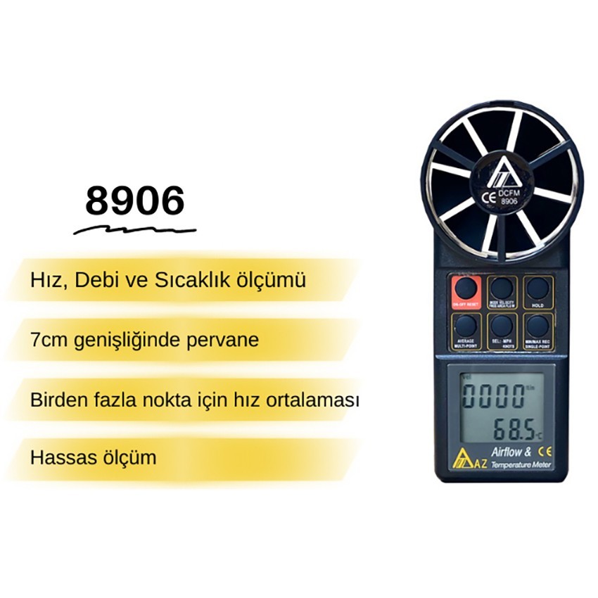 - AZ 8906 ölçüm cihazı; Hava Hızı, Hava Akış Hızı, Hava Debisi ve Sıcaklık ölçümü için büyük pervane proba sahip ölçüm cihazıdır.