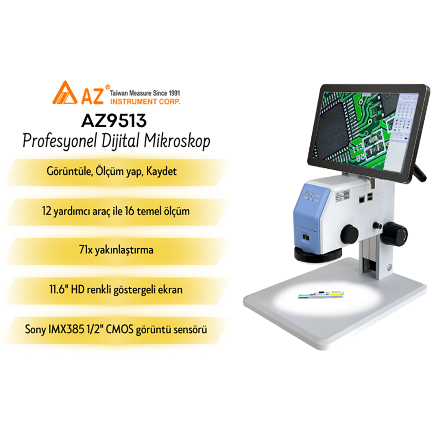 AZ 9513, yüksek hassasiyetli sensörleri ve kristal netlikteki HD dijital göstergesi sayesinde mükemmele yakın görüntü kalitesi sunan, “gözlemle, ölç, kaydet” prensibiyle tasarlanmış profesyonel bir dijital mikroskoptur ve işlerinizde büyük kolaylık sağlar.