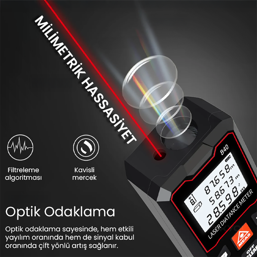 B40 temel seviye lazer mesafe ölçer; 40 metreye kadar ±1.5 mm hassasiyetle ölçüm yapabilen, aynı anda 3 farklı ölçüm değerini ekranda gösterebilen, 50 adet ölçüm kaydını hafızasında tutabilen ve gelişmiş alan, hacim ve Pisagor hesaplama fonksiyonlarıyla profesyonel kullanımlar için tasarlanmış kompakt bir ölçüm cihazıdır.