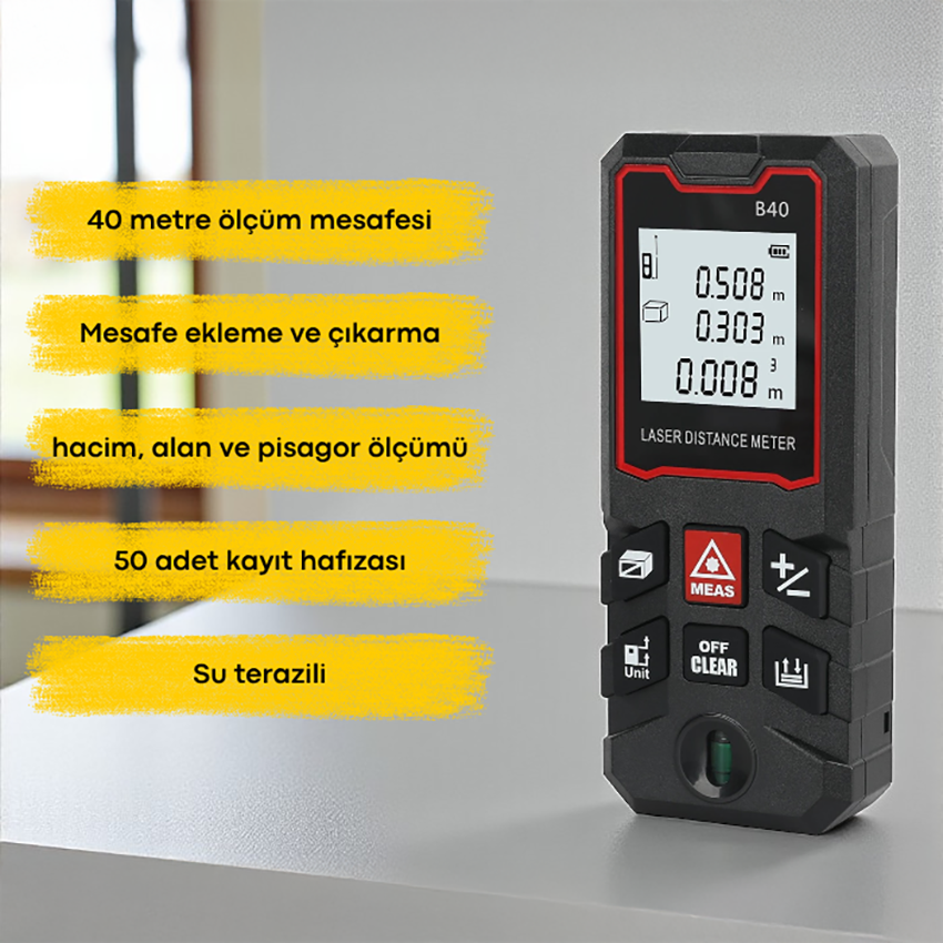 - B40 lazermetre, şantiye ortamları, iç dekorasyon uygulamaları, yapı projeleri ve elektrik tesisat işleri gibi alanlarda tek başına kullanılabilecek çok yönlü bir ölçüm cihazıdır. Lazer teknolojisi ile geleneksel ölçüm araçlarına kıyasla daha hızlı, temassız ve güvenilir sonuçlar üretir.