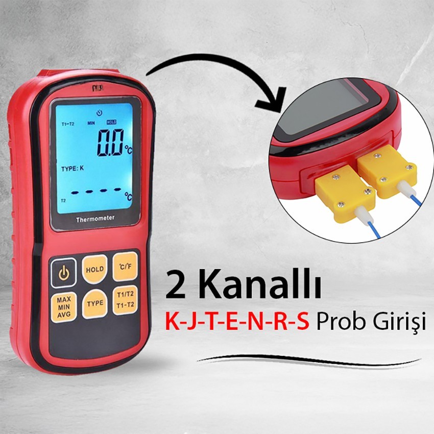 - Bu dijital sıcaklık ölçüm cihazına J, K, T, E, N, R ve S tipi prob bağlanabilmektedir. Cihazın kutu içerisinden 2 adet K tipi prob çıkmaktadır.