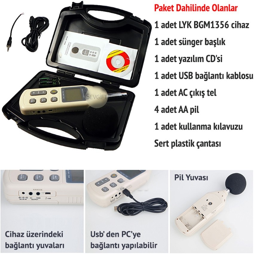 - Benetech GM1356 ses ölçer; 30 dB ile 130 dB arasında ses ölçümü yapabilmektedir.