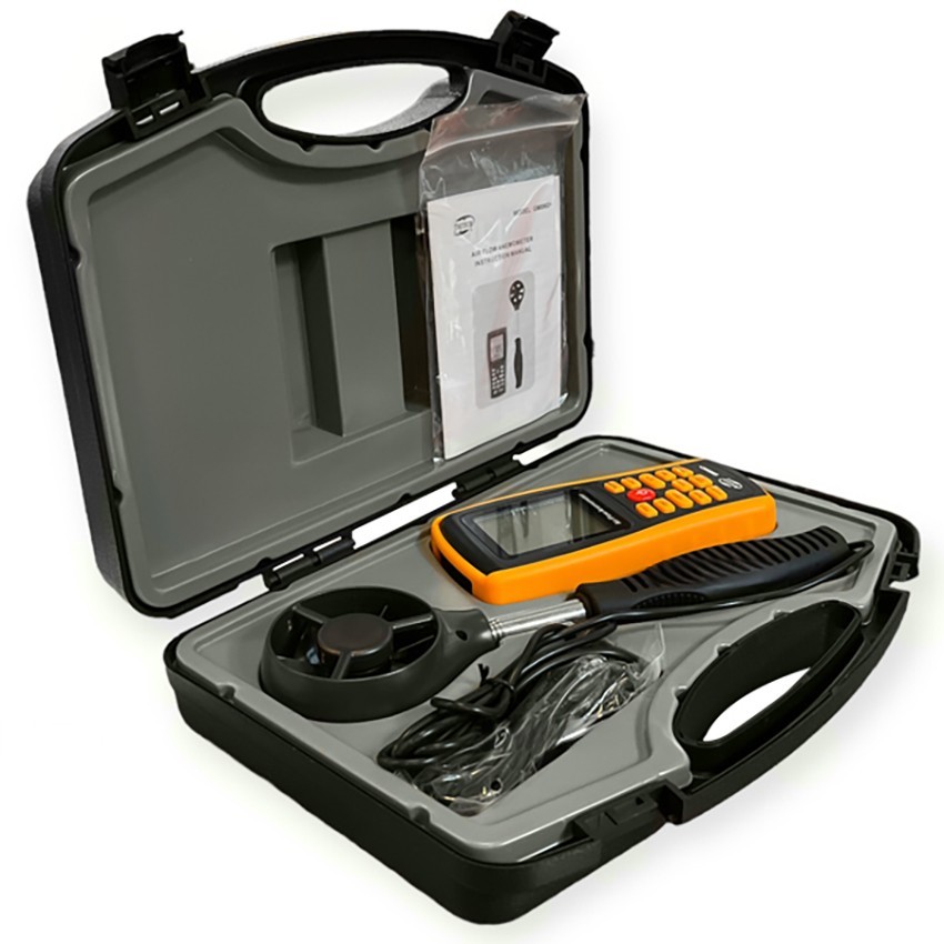 GM8902+ anemometre, 6 fanlı ölçüm pervanesi, USB ara kablosu, 4 adet AAA pil, kullanım kılavuzu, sert taşıma çantası.