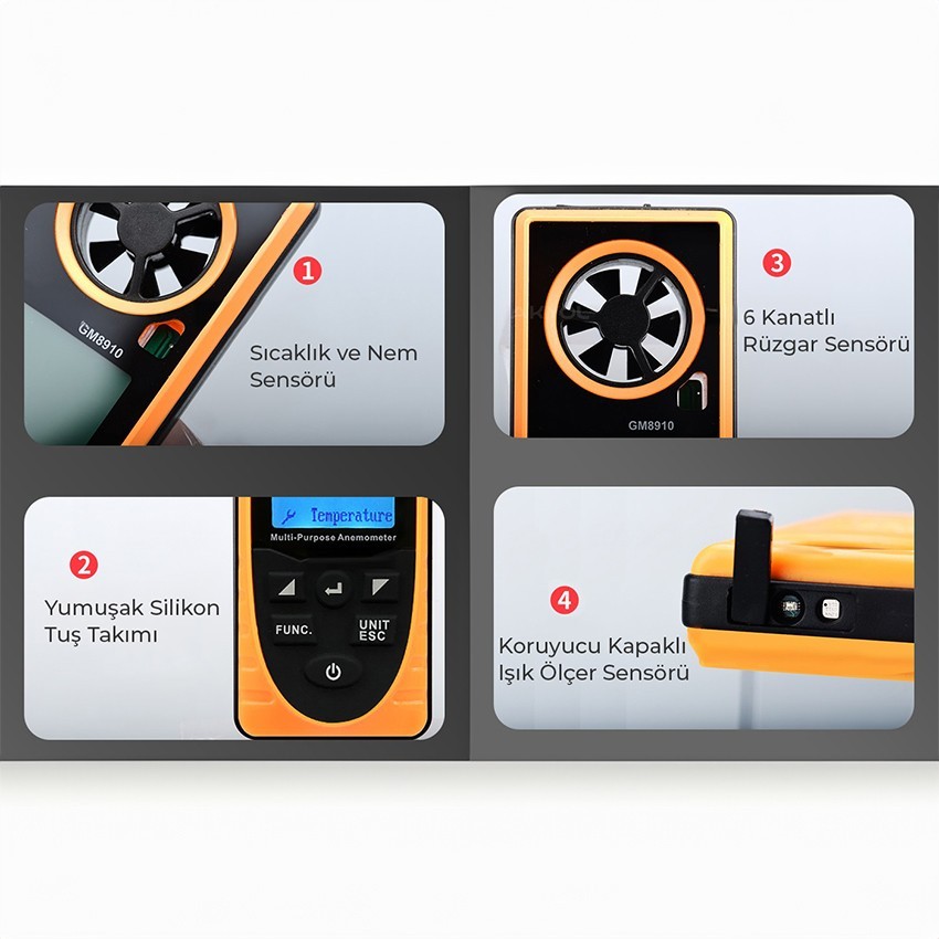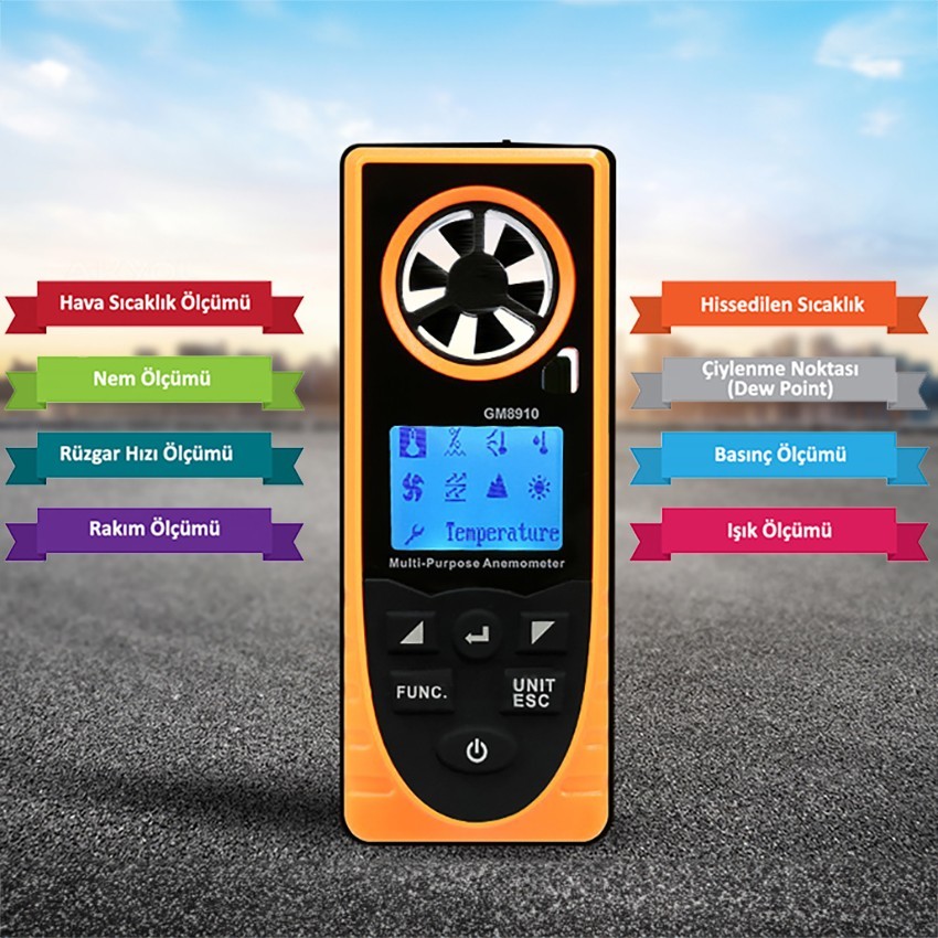 Benetech GM8910 çok fonksiyonlu ölçüm cihazı; havalandırma ve soğutma sektörlerindeki hava hızı ve hava sıcaklık ölçümlerinde kullanılan, bunlardan farklı olarak da ekstra olarak ışık ve rakım ölçümü gibi ölçümler yapabilen, pratik kullanım özelliklerine sahip dijital hava hızı ölçüm cihazıdır