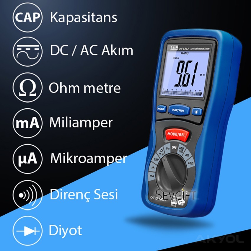 Cem DT 5302 Miliohmmetre ve Dijital Multimetre; yüksek doğruluk ve yüksek performans ve yüksek ölçüm aralığı ile DC ve AC gerilim, DC ve AC akım, düşük değerli direnç, kapasitans ve diyot ölçmek için kullanılan, geniş ekranlı elektronik multimetre çeşididir.