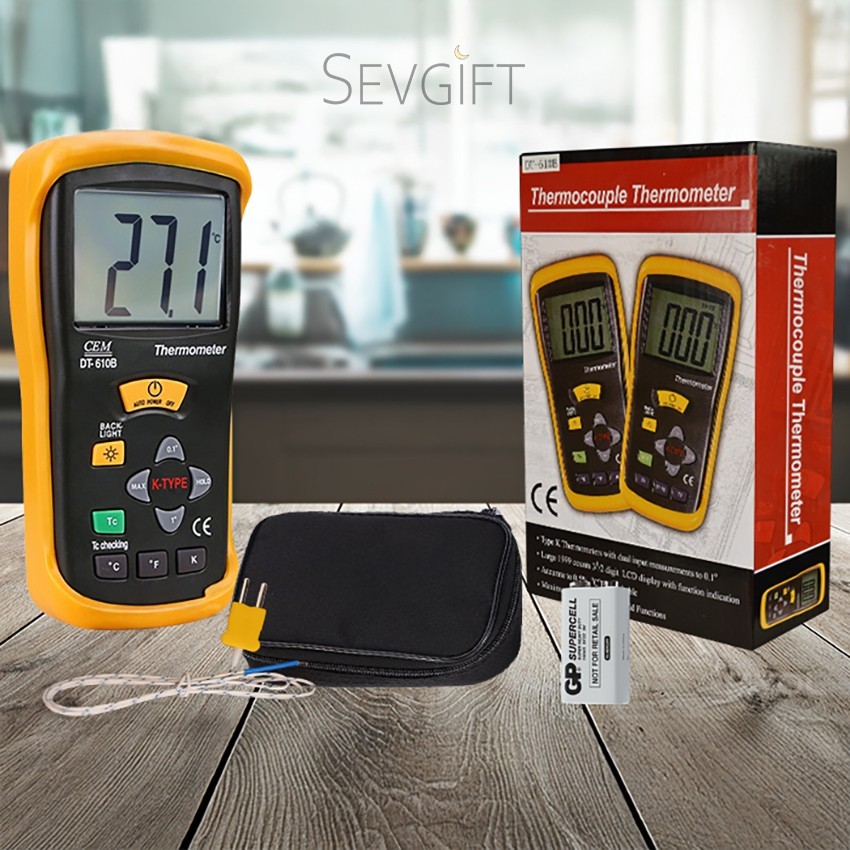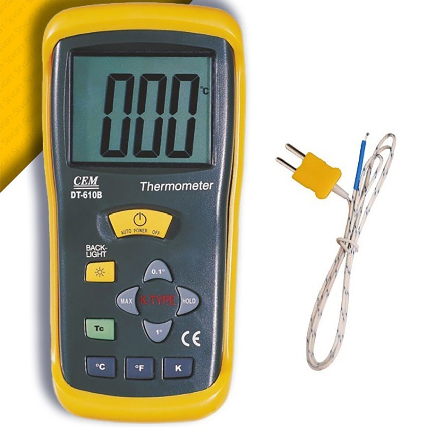 CEM DT-610B tek kanallı K tipi prob okuyucu; k tipi probu sayesinde ortamdaki sıcaklık değeri ölçülebileceği gibi, probun ucunu bir yere değdirerek oranın sıcaklık değeride ölçülebilmektedir.