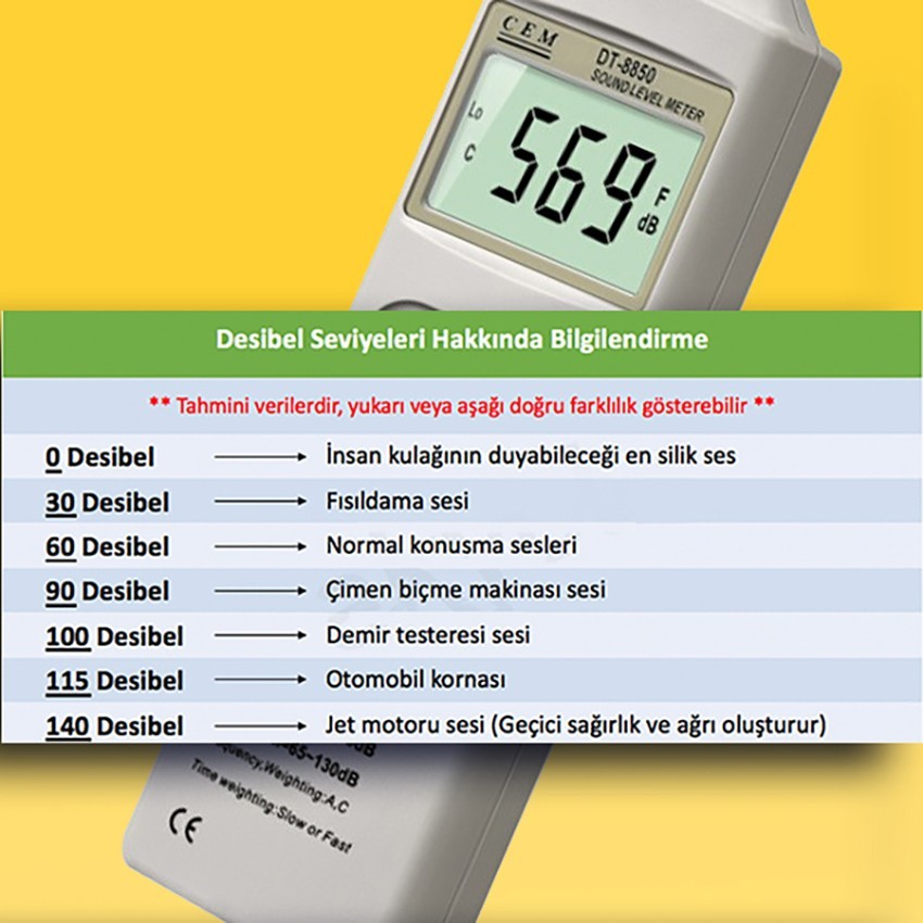 - Cem DT8850 ses ölçer cihazı ile 130 dB' e kadar ses seviyesi ölçümü yapabilirsiniz.