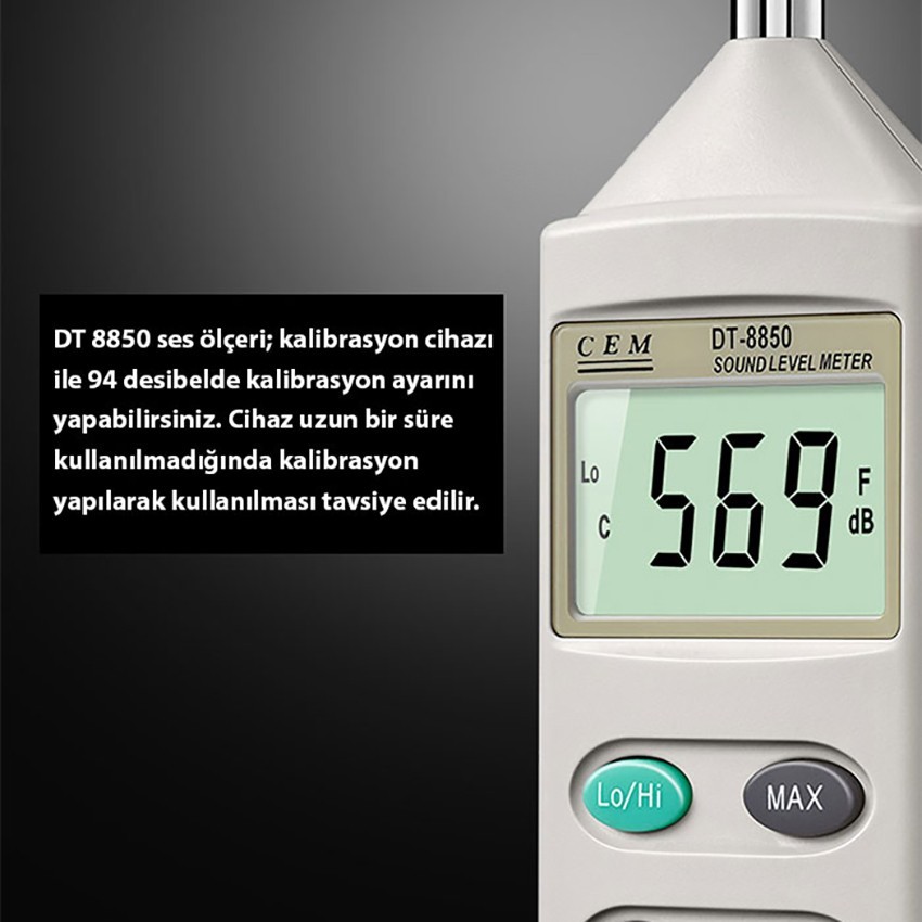 Cem DT-8850 taşınabilir özellikte gürültü ve ses seviyesi ölçer cihazı; kalibrasyon yapılabilme yeteneğine sahip, herhangi bir ortamda bulunan ses miktarını kolaylıkla ölçebilen hassas bir ölçüm cihazıdır.