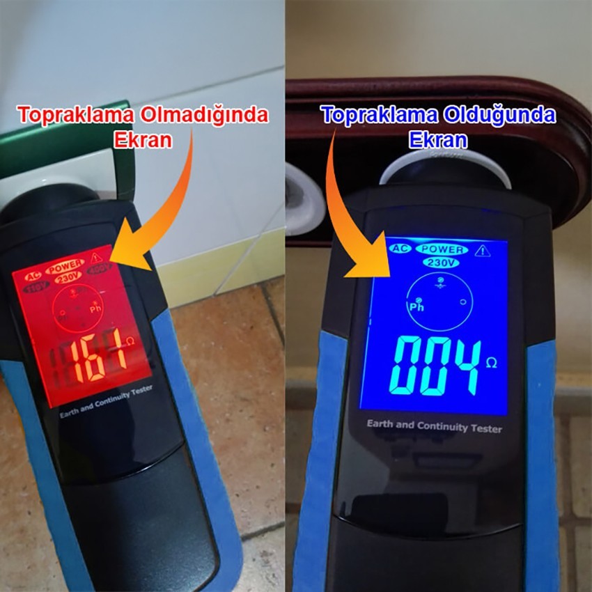 DT-9052 topraklama ölçer cihazı fişe takılır. Ekran mavi renkli ise; topraklama var ve ekrandaki rakam loop empedansıdır. Ekran kırmızı renkte ise; topraklama yok, yanlış gerilim ve gerilim 100 ohm'dan yüksek anlamına gelmektedir. Fazın sağda mı yoksa solda mı olduğu da ölçü aleti ekranından takip edilir. Yanında gelen 6 cm'lik probu seyyar kullanımlar için kullanılmaktadır.