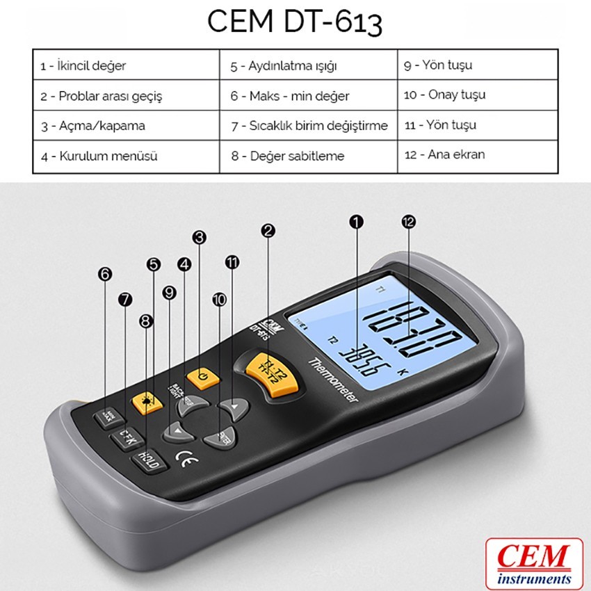Cem DT613 K tipi termometre; üst kısmında bulunan iki kanal ile birbirinden farklı 2 adet K tipi prob bağalabilen ve bu bağlanan probların ölçüm sonuçlarını aynı anda gösterebilen el tipi ölçüm cihazıdır.