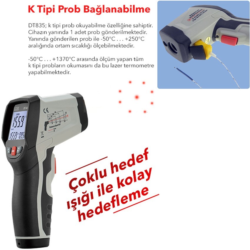 - DT835 lazer termometre k tipi prob okuyabilme özelliğine sahiptir. Yanında kutu içerisinde 1 adet k tipi prob da tarafınıza gönderilmektedir. Cihazın yanında gelen K tipi prob ile -50°C . . . +250°C aralığında ortam sıcaklığı ölçümü yapabilirsiniz.