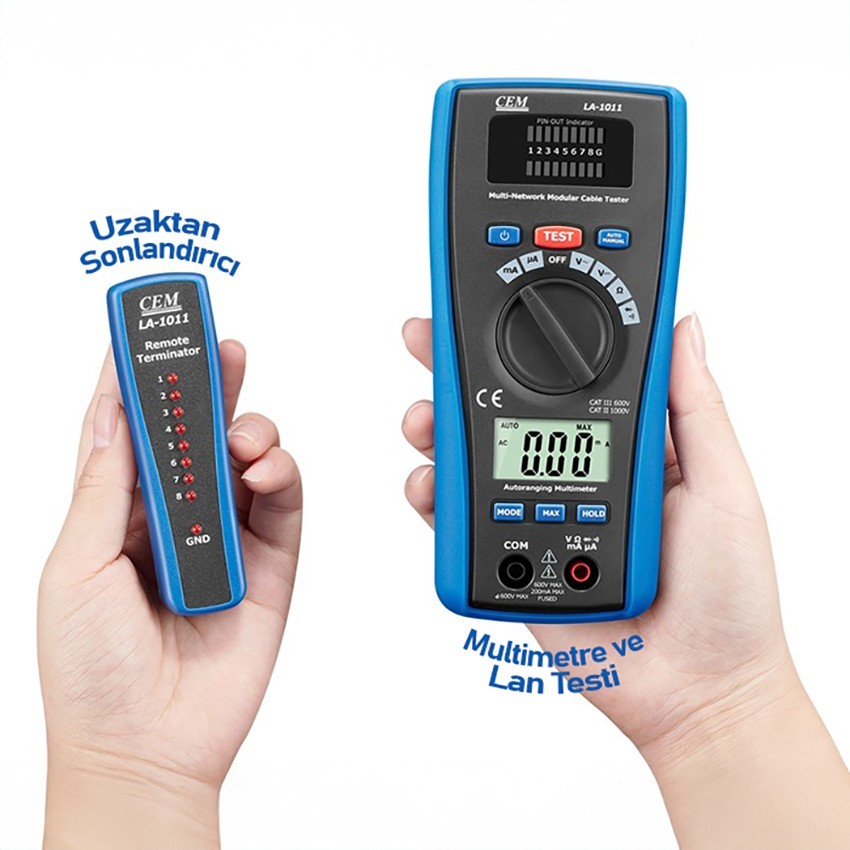 Cem LA-1011 model ölçüm cihazı; akım, voltaj ve direnç gibi multimetre işlevli ölçümlerinin yanı sıra, ağ kablolarının testi, telefon hatlarını ve diğer hatları test etmek için kullanılan hassas test cihazıdır.