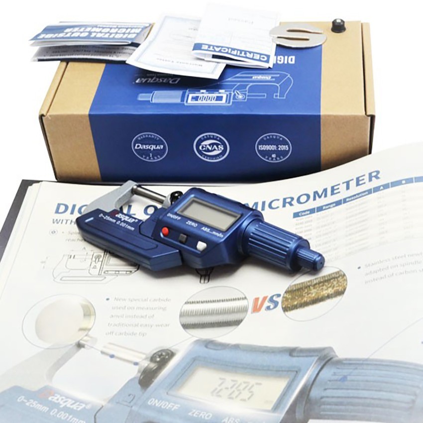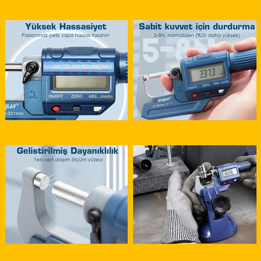 - Dasqua 4230-2005 dijital mikrometre cihazı 0 ile 25 mm arasında 0.001 mm hassasiyetle kalınlık ölçümü yapabilmektedir.