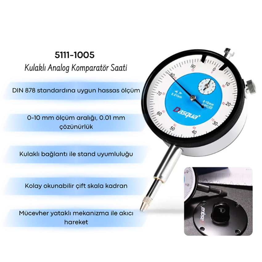 Dasqua 5111-1005 komparatör saati; yüzey düzlüğü kontrolü, mil salgısı ölçümü, kademe yüksekliği ölçümü ve makine ayar işlemleri gibi birçok ölçüm uygulamasında kullanılabilir.