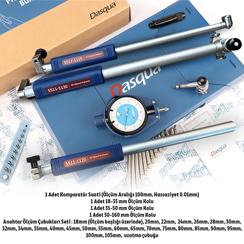 Anahtar Ölçüm Çubukları Seti : 18mm (Ölçüm başlığı üzerinde), 20mm, 22mm, 24mm, 26mm, 28mm, 30mm, 32mm, 34mm, 35mm, 40mm, 45mm, 50mm, 55mm, 60mm, 65mm, 70mm, 75mm, 80mm, 85mm, 90mm, 95mm, 100mm, 105mm, uzatma çubuğu