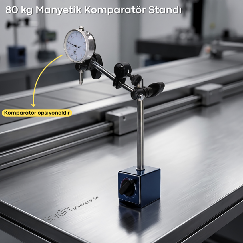 - Metal işleme ve kalite kontrol uygulamalarında kullanılan bu manyetik stand, iş parçası üzerinde salgı, yüzey kaçıklığı, paralellik ve referans kontrolü gibi ölçümlerde komparatör saatinin sabit tutulmasına yardımcı olur.