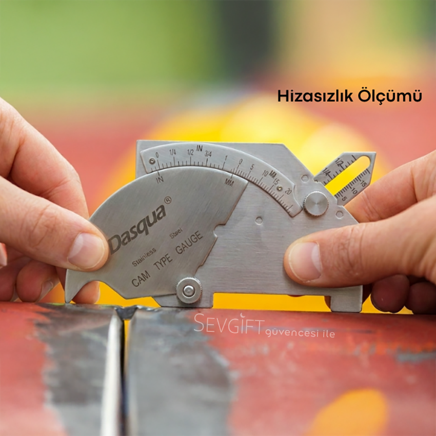 Dasqua 8511-0030 kaynakçı kumpası, kaynak öncesi veya sonrası birleşim yüzeylerinde oluşan hizasızlık (high-low) farklarının hızlı ve pratik şekilde kontrol edilmesine yardımcı olur.