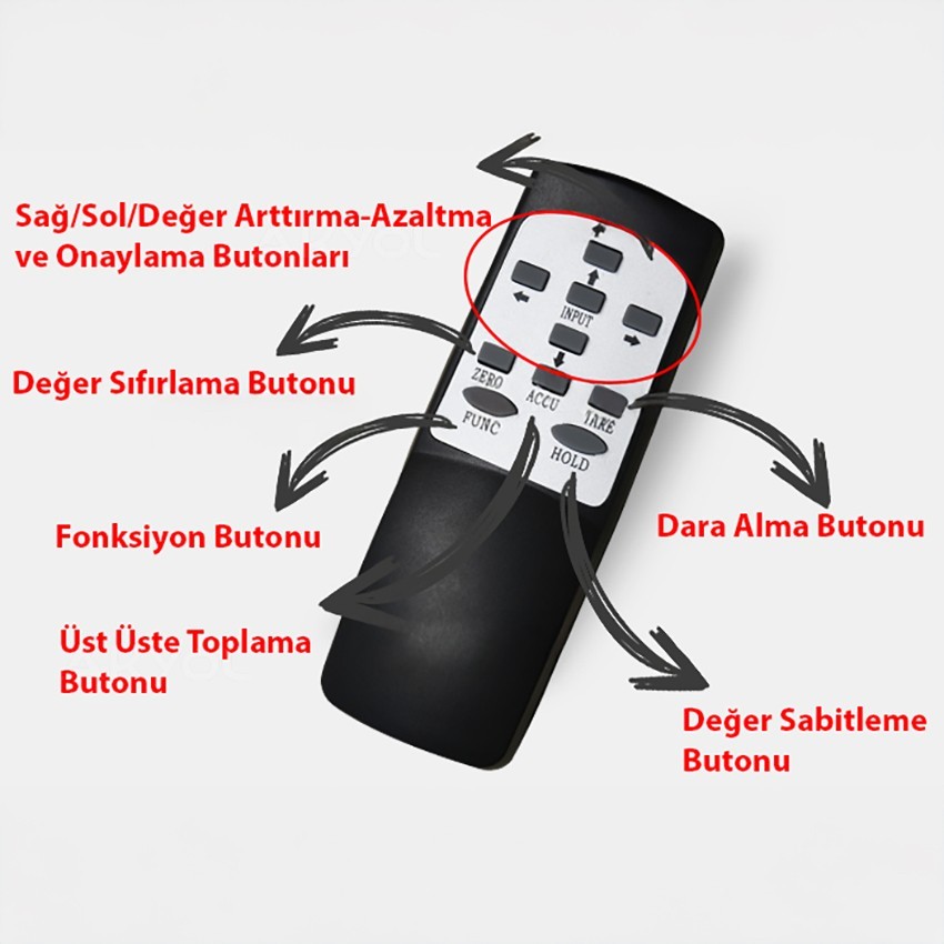 - Uzaktan kumandası ile cihazın darasını alabilir, ekrandaki değeri sabitleyebilir ve toplam hafıza işlemlerini yapabilirsiniz.