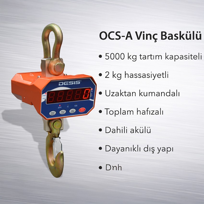 Desis OCS-A vinç baskülü maksimum 5 tona kadar tartım yapabilen ve 2 kilogram hassasiyetli uzaktan kumandaya sahip bir tartım cihazıdır. Döküm halka ve döküm kancası ile dayanıklı bir dış yapıya sahip kaliteli bir vinç basküldür.