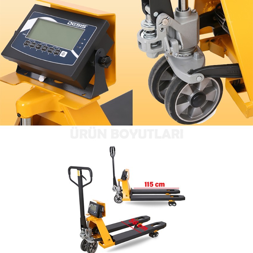 - 2 ton tartım kapasiteli bu Desis transpalet baskül; depolama tesisleri, ağır sanayi bölgeleri, demir çelik fabrikaları olmak üzere birçok kullanım sahasına sahip transpalet basküldür.
