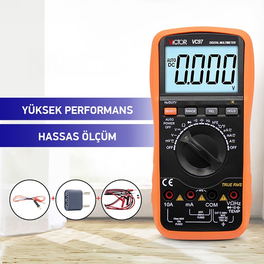 Victor VC97 dijital multimetre avometre; yüksek doğruluk ve yüksek performans ile DC ve AC gerilim, DC ve AC akım, direnç, kapasitans, frekans, sıcaklık, diyot ve süreklilik ölçmek için kullanılan, geniş ekranlı elektronik multimetre çeşididir.