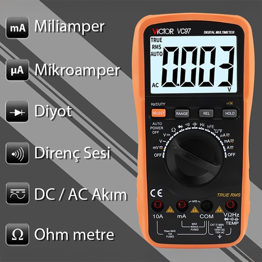 - Victor VC97 dijital multimetre 1000V DC voltaj ve 750V AC voltaj kapasitesine sahip hassas bir multimetre cihazıdır.