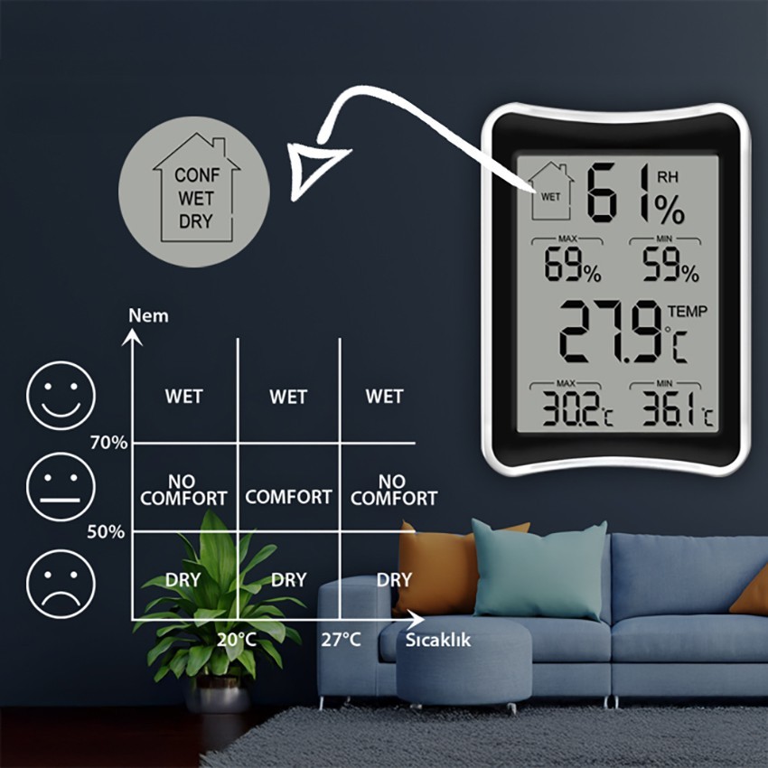 Herhangi kapalı bir ortamda bulunan sıcaklık ve nem değerini ölçebilen, aynı zamanda eş zamanlı olarak MAX ve MIN değerlerini sürekli olarak ekranda gösterebilen, şık görüntüye sahip sıcaklık ve nem ölçüm cihazıdır.