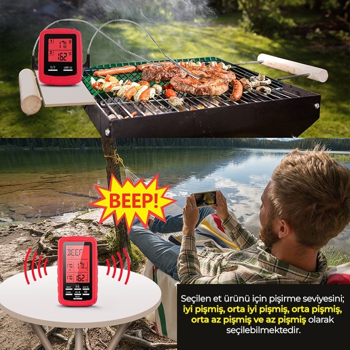 - Bu alarmlı kablosuz dijital barbekü termometresi sayesinde pişen yiyeceğin sıcaklığını 70 metre mesafeye kadar izleyebilirsiniz. Böylece vaktinizi pişen yiyeceğe vermeniz gerekmez, diğer işlere zaman ayırırsınız.