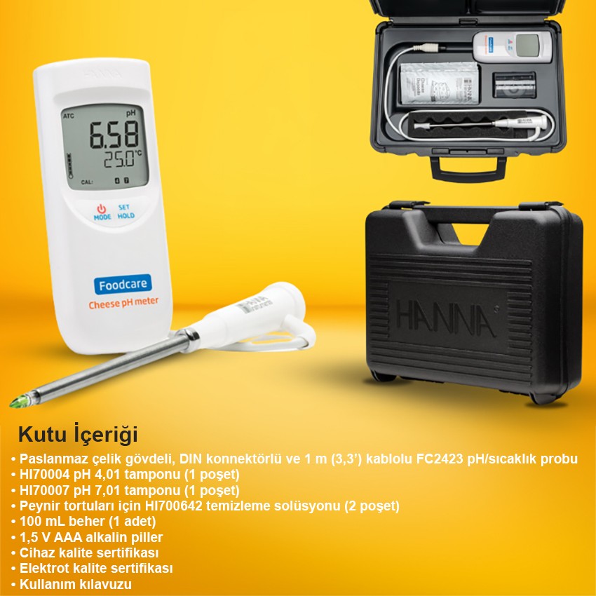 - Hanna HI99165 peynir pH metresi, beyaz peynir, kaşar peyniri, mozzarella, çedar, feta, gorgonzola, rokfor ve krem peynir gibi birçok farklı peynir türünde pH ölçümü yapmak için idealdir.